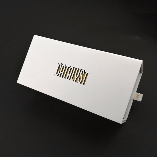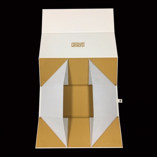 Made by specialty paper+2mm grey board,outside no printing,inside full print spot color and logo debossing,gold hot stamping.