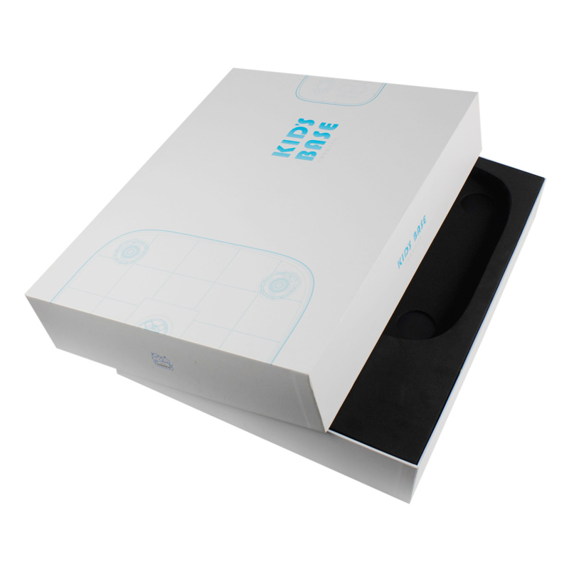 This is a top and bottom box which made by 157g C2S art paper + 1200g grey board,blue logo texture printing on the box, inside of box have custom shaped black sponge padding insert.